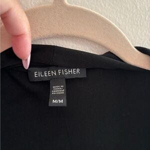 Elegant black silk top from Eileen Fisher in size Medium featuring a flattering crossover drape design. This timeless piece is perfect for work or evening wear!