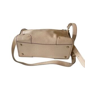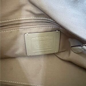 Chic Coach satchel in beige leather. Features dual handles and a detachable strap. Perfect for versatile styling.