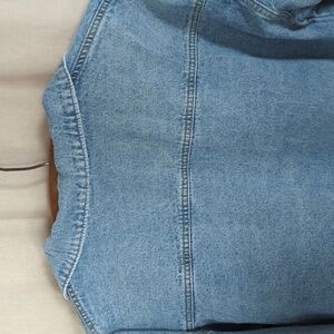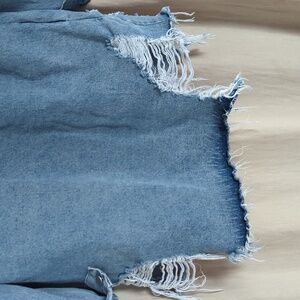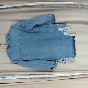Stylish distressed denim jacket with frayed hem. Perfect for casual wear. I picked this up at a boutique out of state and it has no brand or size tags. I would guess maybe a Med/Large or a S/M oversized fit. This jacket is so fun and goes with just about everything. Only had a chance to wear this a handful of times, as I have way too many jean jackets!