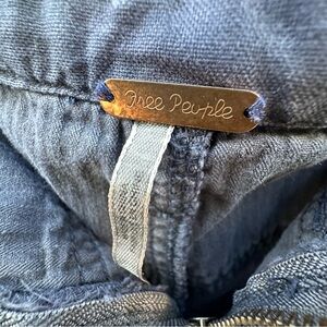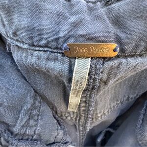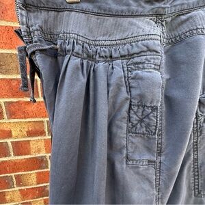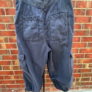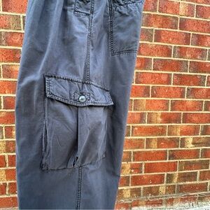 Free People cargo pants with a high waisted pleated front that drapes into a balloon parachute silhouette. Drawstring waist and ankles give these washed navy blue Free People pants a edgy feminine quality. Feminine, harem, cargo, jogger, BOHO. Size tag has some discoloration but it looks like sizing is a 6. Please verify with measurements.