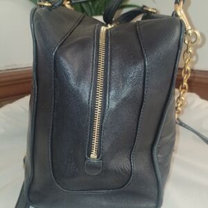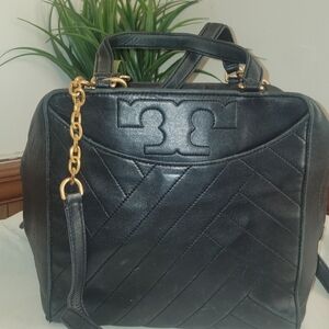 Authentic Tory Burch black leather satchel featuring quilted detailing and gold-tone hardware.