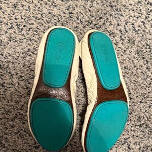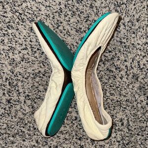 Chic white flats with teal heel stripe. Ideal for versatile wear.