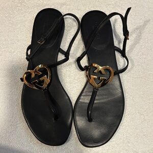 Chic Gucci sandals in black. Features a gold emblem detail. Perfect for stylish outings.