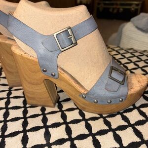 Elevate your look with these elegant blue leather platform sandals. Designed for comfort and style, they are perfect for any occasion. Size 7. Light blue leather 2straps with buckles. 4.25” chunky heel. 1.5” platform. New in box