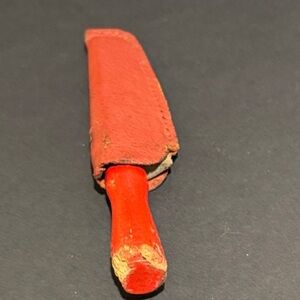 The small carborundum with a red handle is missing wood and paint at the end of the handle. There are tiny chips in the carborundum edge. The miniature stone has an indentation near the top edge for sharpening fish hooks. The gray stone itself can be used to sharpen small knives. The vinyl-like case is worn and faded red with areas on the opening of the sheath missing. It has not been tested for sharpening.