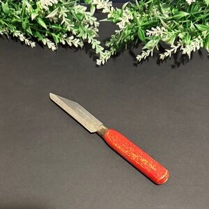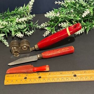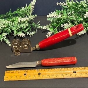 Set of three vintage kitchen utensils with red handles. Includes a paring knife, A&J knife sharpener and a miniature hook hone or carborundum with sheath.