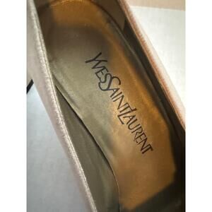 VTG YSL. Gold bucket with brand name. Leather soles. Made in Italy. PLEASE READY - one heel appears to have been repaired, see pics, otherwise only minimal wear on shoes, great preowned condition. Professional, highly rated seller, quick shipper, open to offers! Multiple vintage items available, bundle to save!