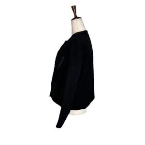 The J McLaughlin Fanning Jacket in Small size is a classic black outerwear piece with braided trim detailing and pockets. This mid-length jacket features a hook & eye closure, 23-inch sleeves, and a collarless design. Made from a rayon blend knit fabric, it is suitable for various occasions including travel, parties, casual outings, workwear, and business settings. Lined with polyester, this Jacket exudes a timeless elegance and sophistication, perfect for the winter, fall, and spring seasons. Ideal for women looking for a stylish and versatile addition to their wardrobe. Never worn and tags have been removed. No flaws or defects. Smoke-free, pet-free home.
