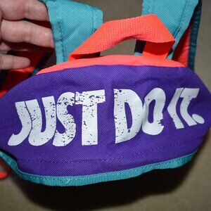 Vibrant Nike backpack with turquoise and purple colors. Features front pocket and bold 'Just Do It' tag. Top of bag also has 'Just Do It' in white print. Ideal for school or play. This backpack has a very 90's throwback vibe!