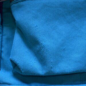 Very light staining on the neon orange/pink back and some pilling on the left front pocket. See photos. (All zippers work great!)