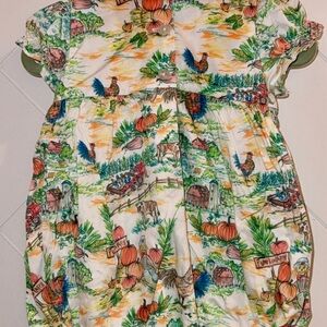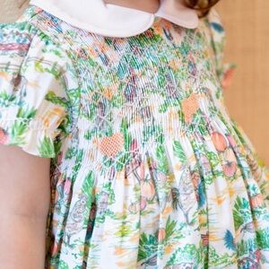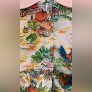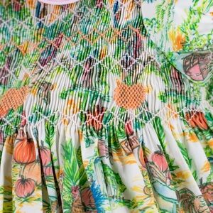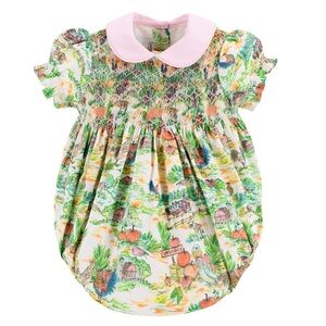 Hand-smocked pumpkins on the chest that adds a delicate charm, while the watercolor farm illustration evokes scenes of playfulness and adventure. This bubble captures the spirit of pumpkin patches and carefree days on the farm, all in an outfit made for memory-making.