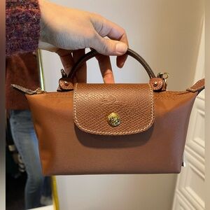 Longchamp | Le Pliage Cognac Original Pouch w Handle + Long Strap kit installed
