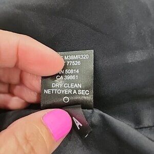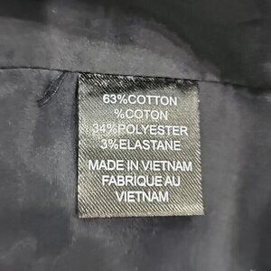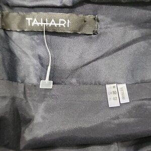 Elevate your workwear or travel wardrobe with this Tahari navy blue lined mini pencil skirt. The skirt features a back slit accent and a zipper closure. Its solid pattern, short length, and lightweight fabric make it perfect for all seasons. Made of a blend of Polyester, Spandex, and Cotton, the skirt is dry clean only. It comes in a size 6 and is perfect for business or any occasion that requires a stylish yet comfortable outfit. Add this versatile piece to your wardrobe today!