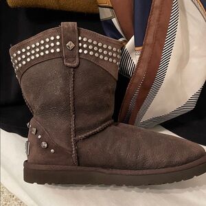 Chocolate and a girls best friend besides her momma chocolate boots can you believe it !!featuring silver studs as well as crystal embellishments. These babies have Bling Swarovski Crystals and so soft inside very well kept ,clean one owner me ,Come from smoke and pet free home ,told you ladies Ive got to clean out the closet ( upstairs) well im trying to
