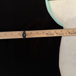 Textured material. Fit & flare skater dress style. Black with aqua colored neckline and arm trim.