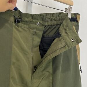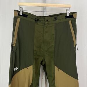 Zip fly, snap close, cinchable waist, relaxed fit, zipper pockets on legs and in rear, lined zip-ankle vents, cinchable hem. Woven performance fabric in a green / tan colorblock style.