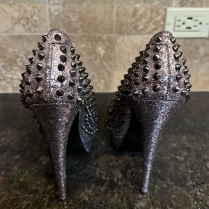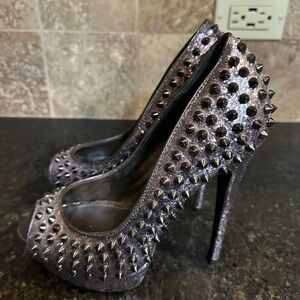 Chic silver heels with bold studded design. Peep-toe style for a modern look. Ideal for adding flair to any outfit. These are Brand New Sz 7M