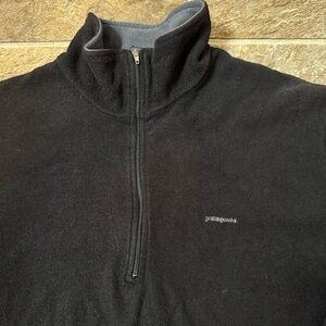 Cozy dark gray pullover with Patagonia branding. Ideal for layering.