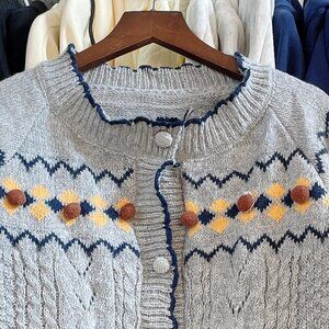 The sweetest embroidered floral pattern in yellow and brown across the shoulders and sleeves - absolutely adorable! Combined with cable knit texture and zigzag details, this piece has so much character.