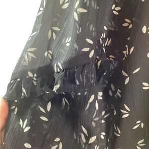 The little black blouse gets a fun ditsy print. Take this top from desk to drinks on a Friday evening. Features a split neckline where it meets a flirty ruffle trim that winds around long balloon sleeves. A classic fit bodice can easily be worn tucked into black denim with matching chelsea boots for an ultra moody ensemble.