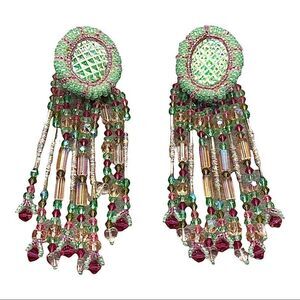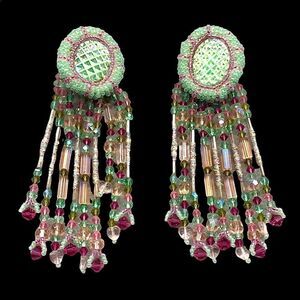 Totally amazing pair of one of a kind artist made glass beaded by Lisa Jo Silberkleit of Sonoma. The top of the earrings have large iridescent European glass cabs with an embossed diamond shape, the colors are changing and beautiful. There are pink glass beads against the stone and then surrounded with green and pink glass beads. The multiple dangling strands are made up of faceted crystal beads in pink, purple,green,ab peach,fiber wrapped bugle beads, and pink heart shaped beads. The earrings measures 4.5”X 1.5” Please see all photos for full description. These are show stoppers, runway ready, way better then the photos. The colors are amazing. I just saw the Guo Pei show, these are so in line with that style...