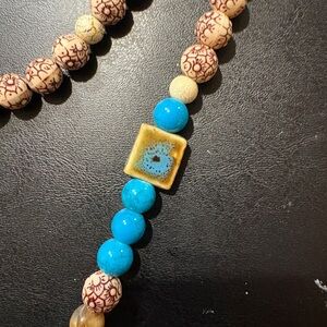 Elevate your look with this elegant necklace, showcasing a stunning blend of blue and cream beads. Perfect for adding a touch of sophistication to any outfit.