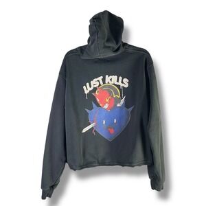 Keywords: graphic hoodie, streetwear, distressed, raw hem, oversized, cropped, skater, goth, alternative, heavyweight, DIY crop, worn in, rugged, distressed, everyday, layering