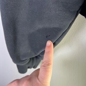 No noticeable stains. The hem has been cropped and is uneven and ragged in places. There are a few small holes/wear spots on the sleeve, which I tried to capture in photos. The collar is coming undone or has been cut. Some general wear and distressing.