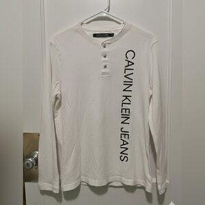 Stylish white long sleeve tee with bold logo. Comfortable and modern design.
