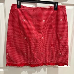 Sweet and playful red gingham mini skirt with delicate embroidered floral details throughout. Features a flattering straight silhouette and a feminine ruffle hem for a charming cottagecore look. Perfect for summer outings, picnics, or styling with a fitted tee or cardigan for an effortless vintage-inspired outfit.