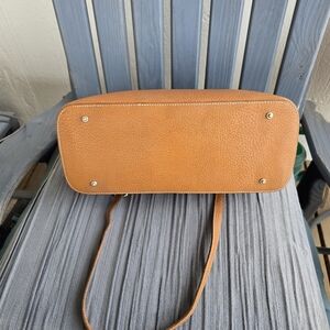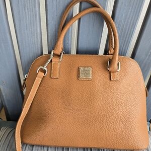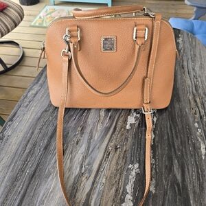 Dooney & Bourke Stylish tan leather satchel bag with adjustable strap and silver hardware.