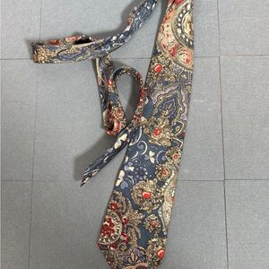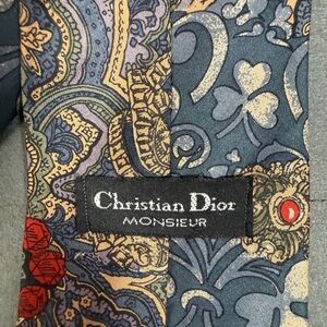 Elevate your formal wear with this exquisite vintage Christian Dior Monsieur necktie. Crafted from 100% silk, this tie features a stunningly intricate baroque print with ornate scrollwork, red jewel motifs, and subtle shamrock/clover details on a dark slate blue background.
