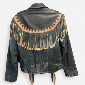 Vintage Black Leather Fringe Jacket Studded Western Moto Small