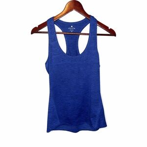 Athleta Shadow Stripe Chi Tank in blue, size XS. Lightweight performance tank with racerback design and subtle textured stripe fabric. Perfect for workouts, yoga, running, or casual athleisure wear.