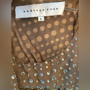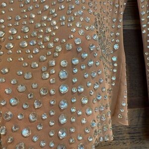 This nude mesh long sleeve top by English Factory features a fitted silhouette adorned with intricate embellishments. The shimmering details create a glamorous look, making it a standout piece for any occasion. Item is new in bag, however no tag is attached.