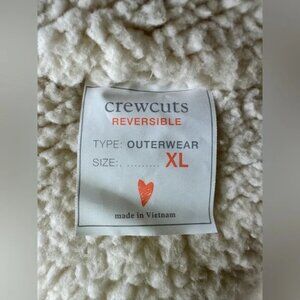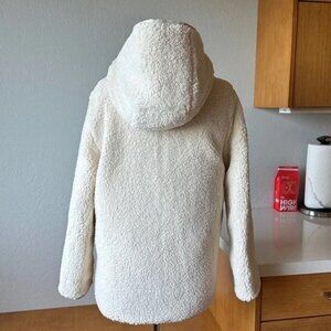 Zip front, hooded, front pockets, completely reversible. Barely visible pulling on fleece side.