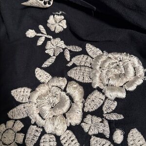 Elegant black jacket featuring intricate white floral embroidery. Perfect for adding a touch of sophistication to any outfit. Two front pockets and front tie belt. Suitable for framing too!