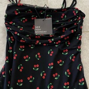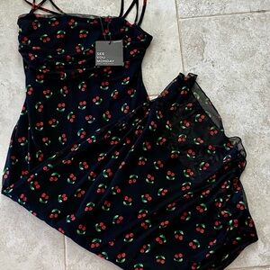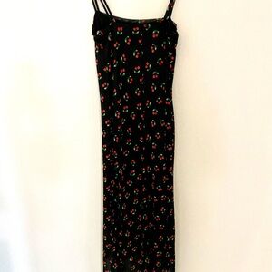 Stylish black maxi dress with cherry print. Features a fitted design and thin straps. New with tags