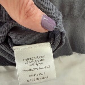 Elevate your knitwear collection with this chic Line & Dot Sylvie sweater. Featuring a unique asymmetric, notched neckline that can be worn slightly off-one-shoulder, this piece offers a modern twist on a classic grey pullover. The fabric is a soft, high-quality rayon blend with a beautiful drape and ribbed cuffs.