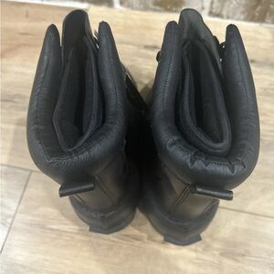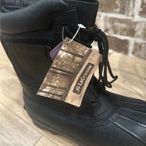 The LaCrosse Thinsulate Ultra Cold Weather Winter Boots in size 8 with steel toe are designed for ultimate warmth and protection during the cold winter months. These lace-up boots feature a solid black color with a round toe shape, making them suitable for both activewear and workwear occasions. The boots are lined, waterproof, and insulated, with a durable rubber outsole for stability on snowy or icy surfaces. Crafted with leather upper material and featuring a steel toe for added safety, these boots are ideal for outdoor activities such as hunting and work in the snow.