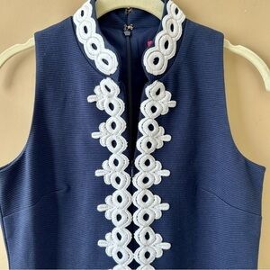 This Navy Blue Callista Shift Dress from Lilly Pulitzer features nautical embroidered white lace detailing at the bodice, a v-neckline with a zippered collar, and a classic sleeveless mini sheath silhouette in thick ribbed ottoman fabric. This piece has a concealed back zipper, bra-stays / lingerie straps at the inside shoulder, and a full lining. 67% polyester, 32% cotton, 1% spandex. Still selling for full price at Nordstrom