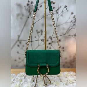 Size 13” x 14”, sold out in Stores . So boho, super soft suede and adjustable straps