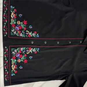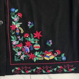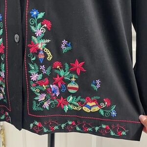 Thi shirt is a vintage Tabi International long-sleeve button-down blouse in velvet velour featuring a festive or Christmas-themed embroidery along the placket and hem.