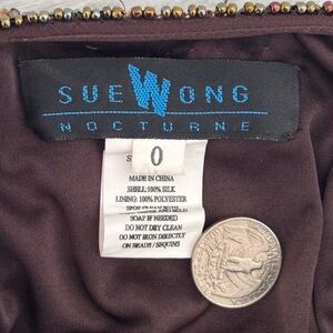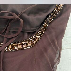 Chic dark brown dress by Sue Wong. Features elegant beaded trim. Ideal for evening wear.
