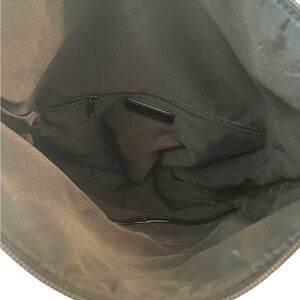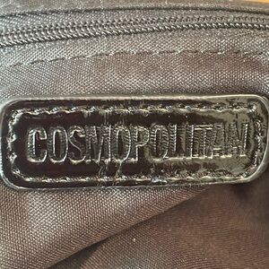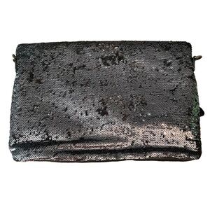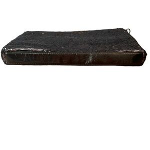 Cosmopolitan Black metallic sequined clutch. Zippered top that folds over with snap closure. Lots of room and zippered compartments. In very good condition, only call out is chain is missing. Easily replaced if you choose. Price reflects this.