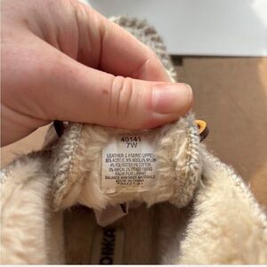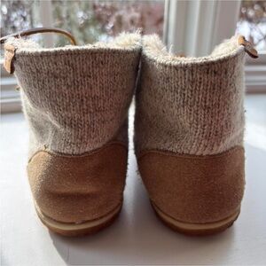 Warm moccasin boots with knit and suede design. Features a soft, fuzzy interior and lace-up front.