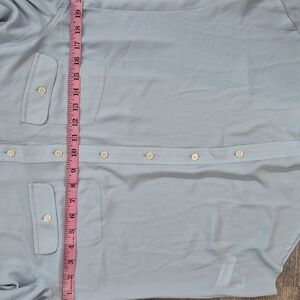 This is a pre-owned LOFT brand button-down shirt, size medium. It features a light blue color, long sleeves with roll-up tabs, and two chest pockets with button closures. The shirt has a full button-down front. The material appears to be a lightweight, possibly synthetic fabric. There are no immediately visible stains, tears, or other significant imperfections. The shirt is in good, wearable condition.