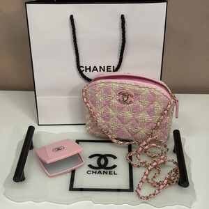 GWP Chanel crossbody bag in pink and cream tweed. Features iconic logo and chain strap. Stylish and elegant. This is really a cute mini bag and please note a phone will not fit in it. Mine is a Pro Max and it's too big for this bag. ALSO A GWP PINK CHANEL MIRROR