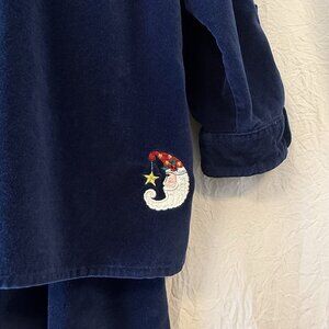 Beautiful two-piece velour set by Quacker Factory in size 2X. It is in great preowned condition. It is a gorgeous blue color and has embroidered and beaded Santas in a moon shape on the button down shirt. The pants are pull-on with an elastic waist. This is the perfect cozy set for the upcoming Christmas season