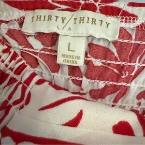 New with tags. Red and white sleeveless halter romper from Thirty Thirty. Fully lined with a comfortable, easy fit. The tag was removed but is shown in photos; item has never been worn.